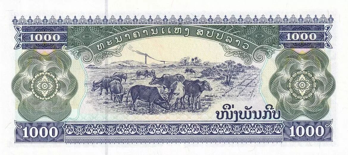 Le verso du billet illustre une scène pastorale avec du bétail en pâturage, évoquant l'importance de l'agriculture et de l'élevage dans l'économie laotienne. La présence de pylônes électriques suggère la modernisation et le développement infrastructurel du pays. Comme au recto, les inscriptions sont en lao. Le filigrane du billet représente un marteau et une faucille surmontés d'une étoile, symboles associés à l'idéologie politique du pays.