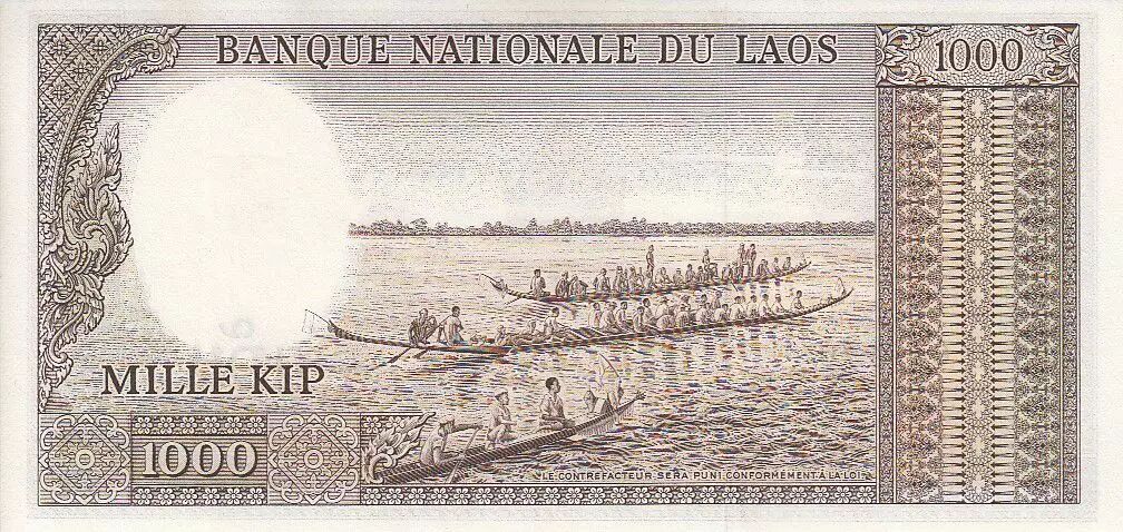 Billet Laos 1000 Kip, Roi Savang Vatthana, temple - Pirogues - 1963 - P.14 b