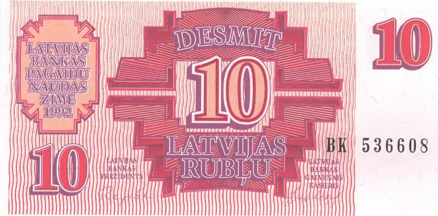 Banknote Latvia 10 rublu - Symmetrical design - 1992 - Serial BK