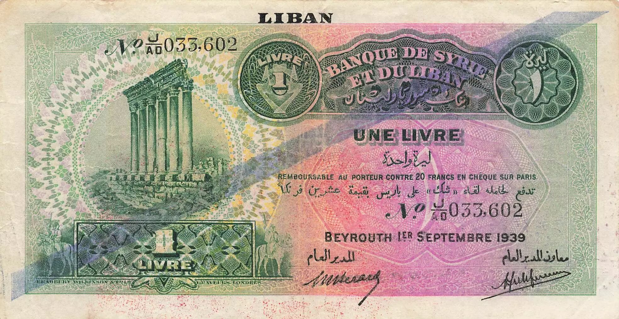 Home > World Banknotes > Asian Banknotes > Lebanon > Lebanon 1 Pound - 01-09-1939 - P.26