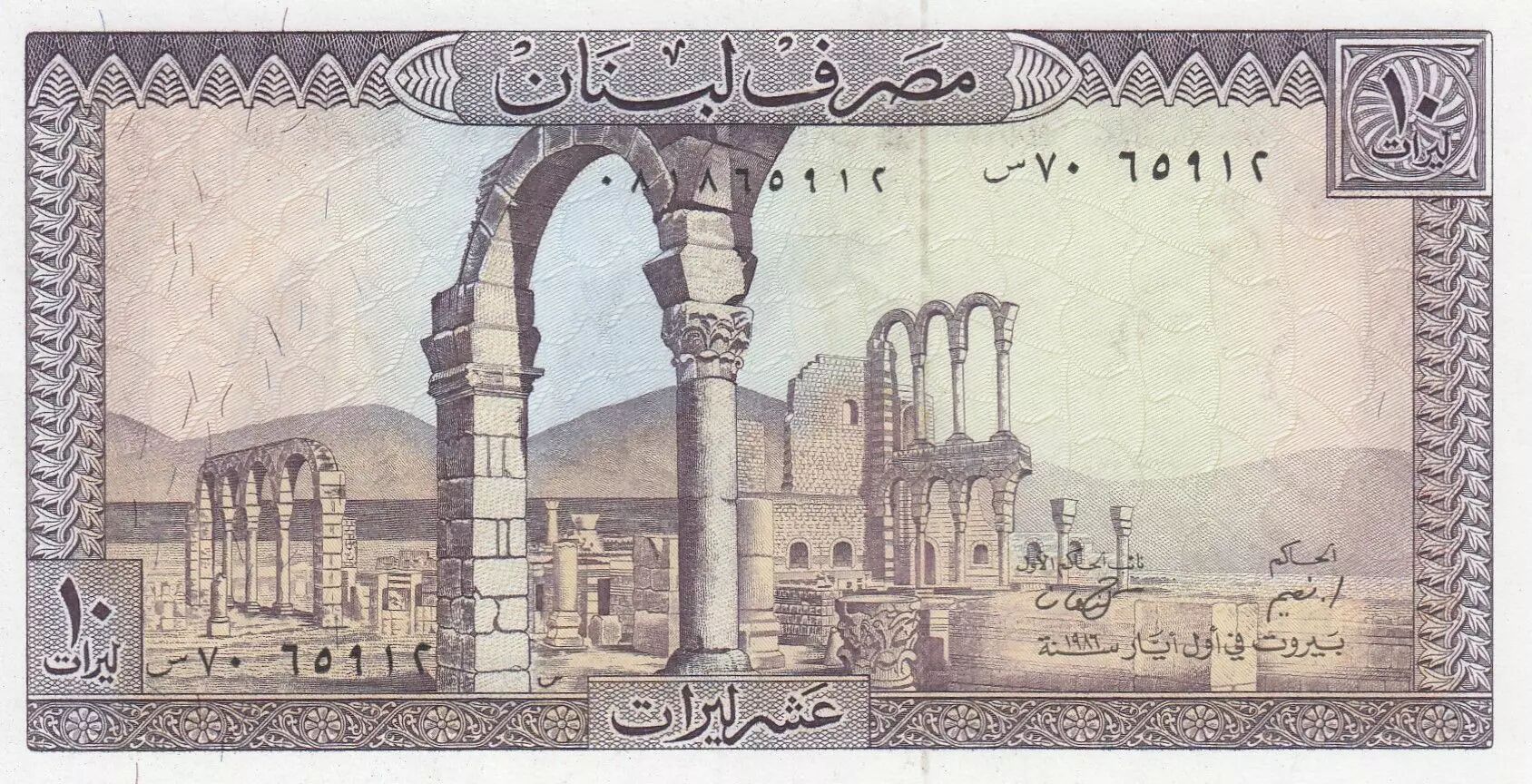 The 10 Lebanese Pound note, issued in 1986, features a representation of the ruins of Anjar on its obverse. This ancient city, located in the Bekaa Valley, bears witness to Lebanon's history and architectural heritage.