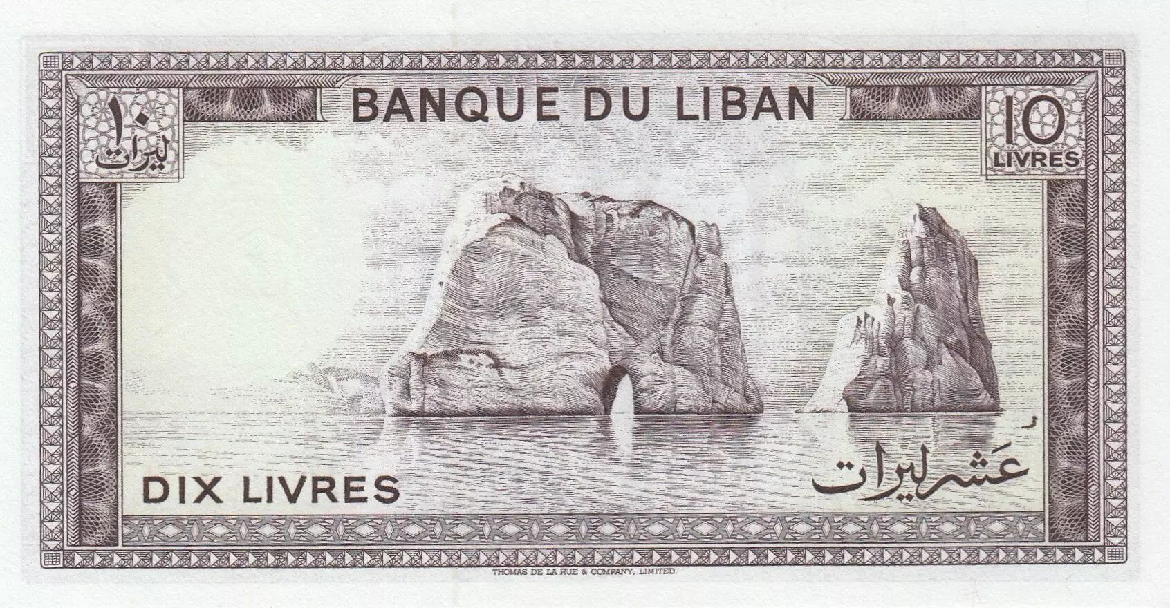 On the reverse, the note illustrates the rock formations of Rawsheh, an emblematic natural site located near Beirut. These formations, sculpted by marine erosion, offer a distinctive landscape and are a symbol of the Lebanese coast.