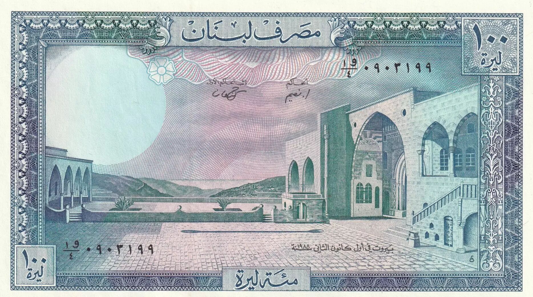 Home > World Banknotes > Asian Banknotes > Lebanon > Lebanon 100 Pounds Beit-ed-Bin Palace - Cedar - 1988