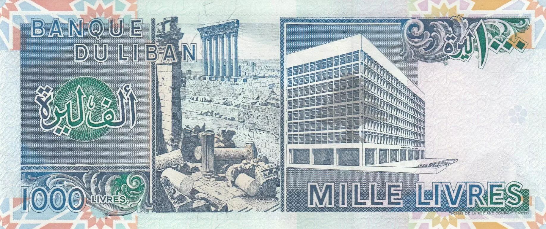 The back of the banknote illustrates two distinct elements of Lebanese heritage. On the one hand, there is a representation of the columns of Baalbek, impressive vestiges of a major archaeological site, testifying to the ancient history of the region. On the other hand, the back also features an image of the building housing the Banque du Liban in Beirut, symbolizing the country's central financial institution.