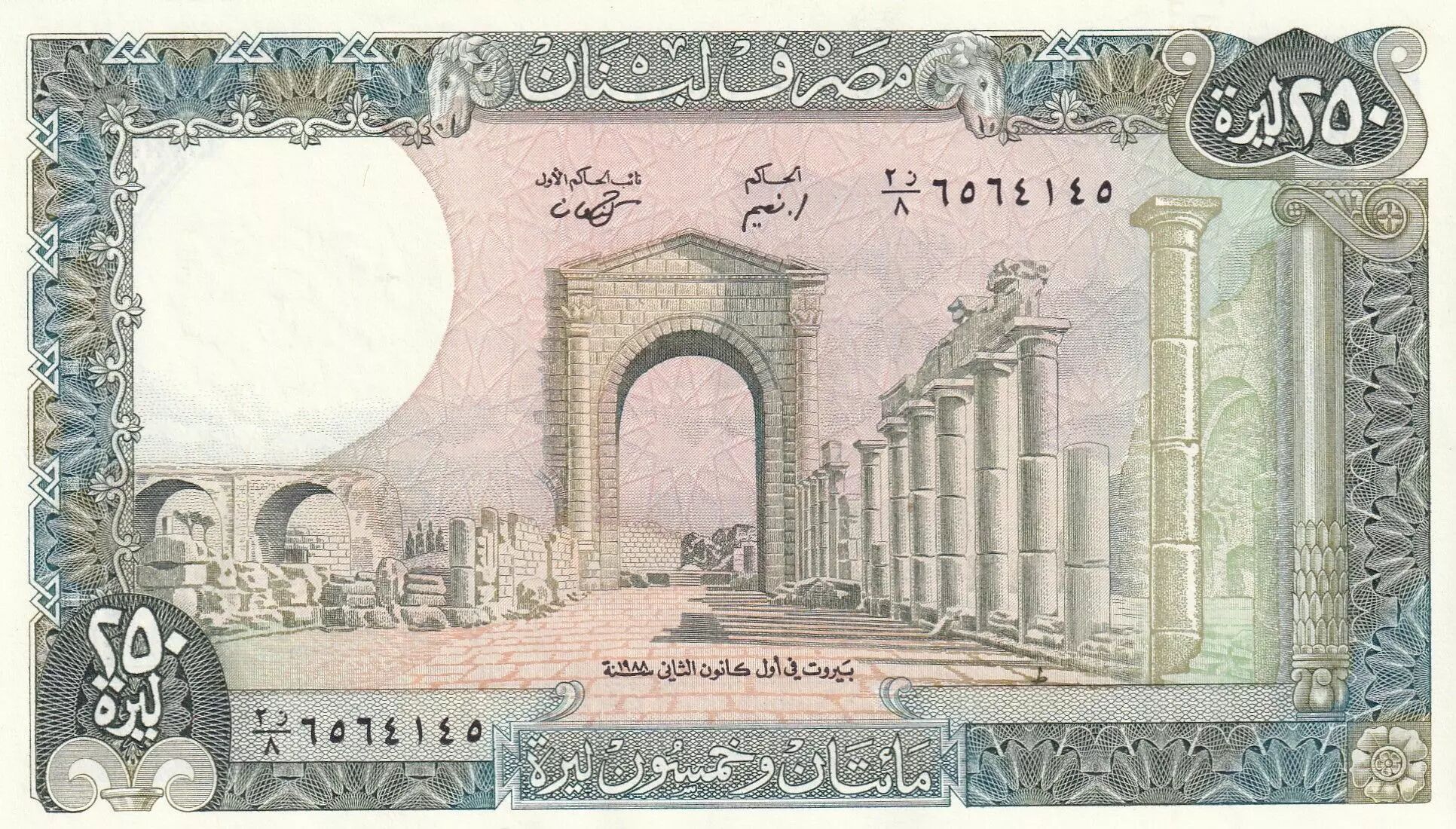 Home > World Banknotes > Asian Banknotes > Lebanon > Lebanon 250 Pounds Ruins of Tyras - 1988