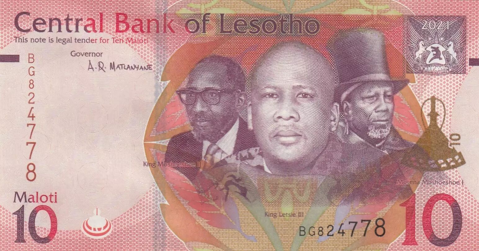 Le Lesotho a émis en 2021 un billet de 10 maloti faisant partie de la série BG. Ce billet présente des caractéristiques visuelles distinctes sur ses deux faces.