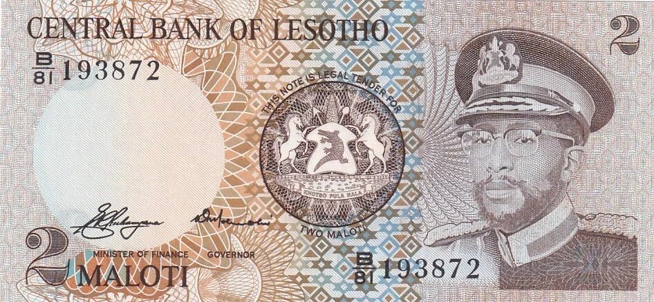 Le recto du billet présente un portrait de Moshoeshoe II, figure emblématique du Lesotho. On y voit également une représentation du bâtiment du chapeau basotho situé à Maseru, un symbole culturel important du pays. La valeur nominale de "2" est clairement indiquée, ainsi que la devise "maloti".