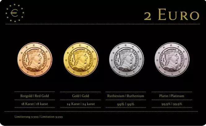 Pour chaque pièce : Bi-métallique : centre en maillechort (cuivre zinc et nickel) - anneau en cupronickel (nickel et cuivre) - 8 50 g - Ø 25 75 mm.