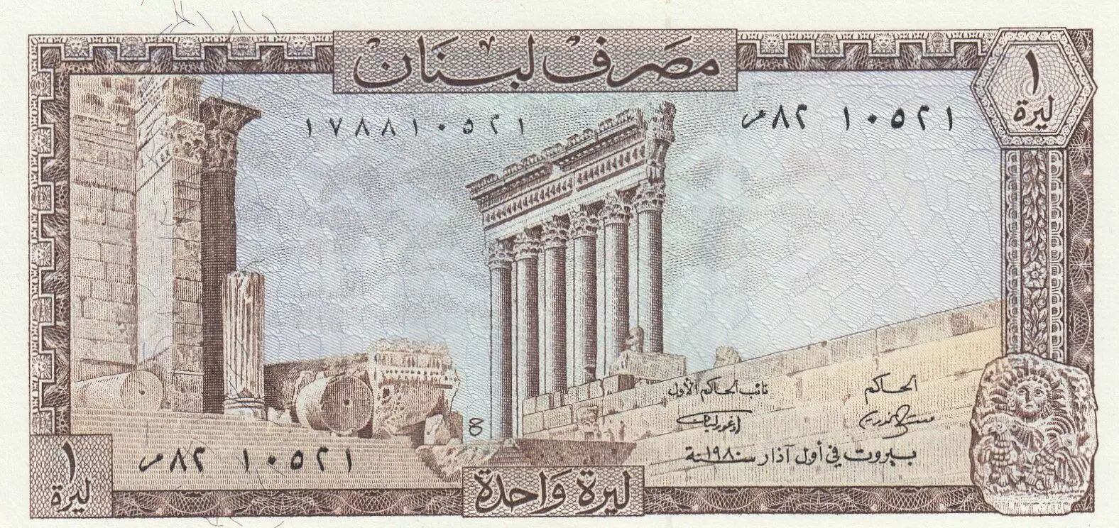 Ce billet de banque, d'une valeur nominale d'une livre libanaise, a été émis en 1980 par la Banque du Liban. Il s'agit d'un spécimen de la série courante de cette période.
