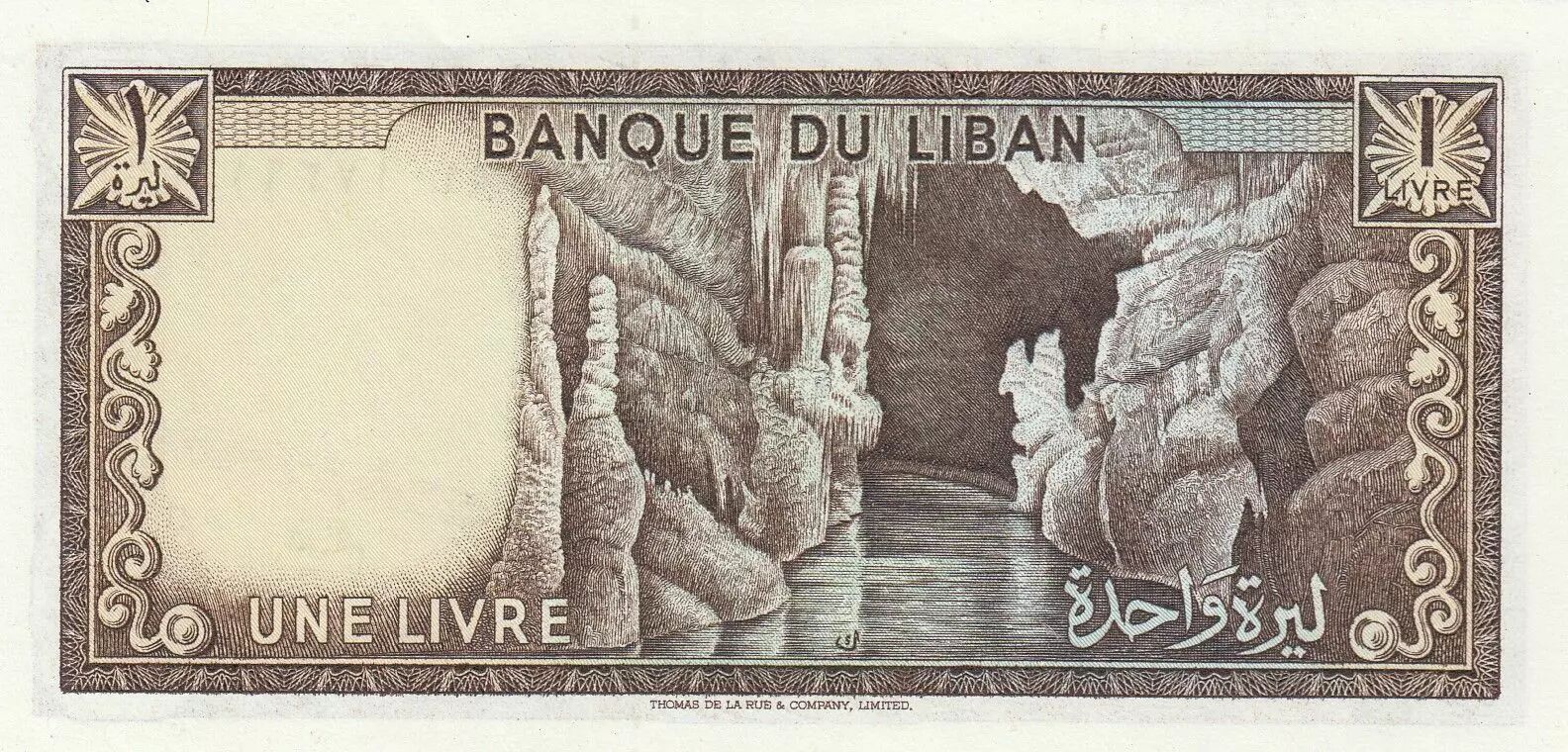 L'avers du billet présente des inscriptions en langue arabe. On y trouve le nom de l'institution émettrice, "???? ?????" (Banque du Liban), ainsi que la valeur faciale, "? ????" (Une livre). La typographie est soignée et témoigne des standards graphiques en vigueur au moment de sa conception.