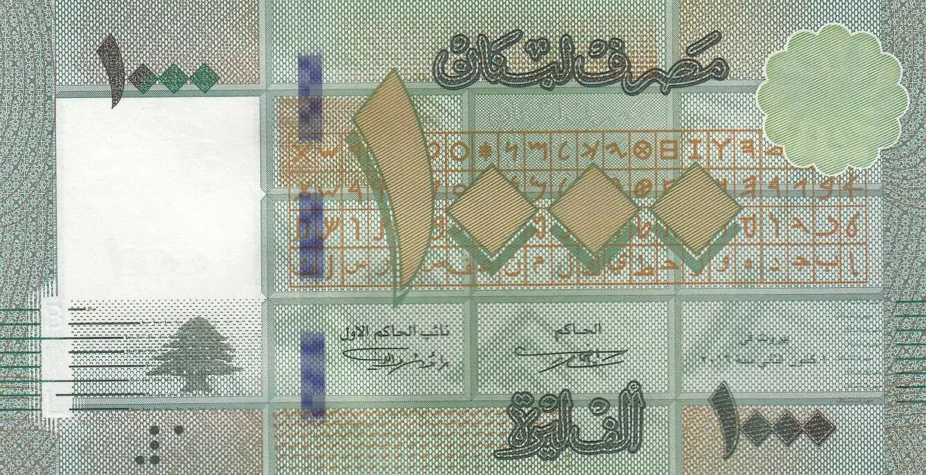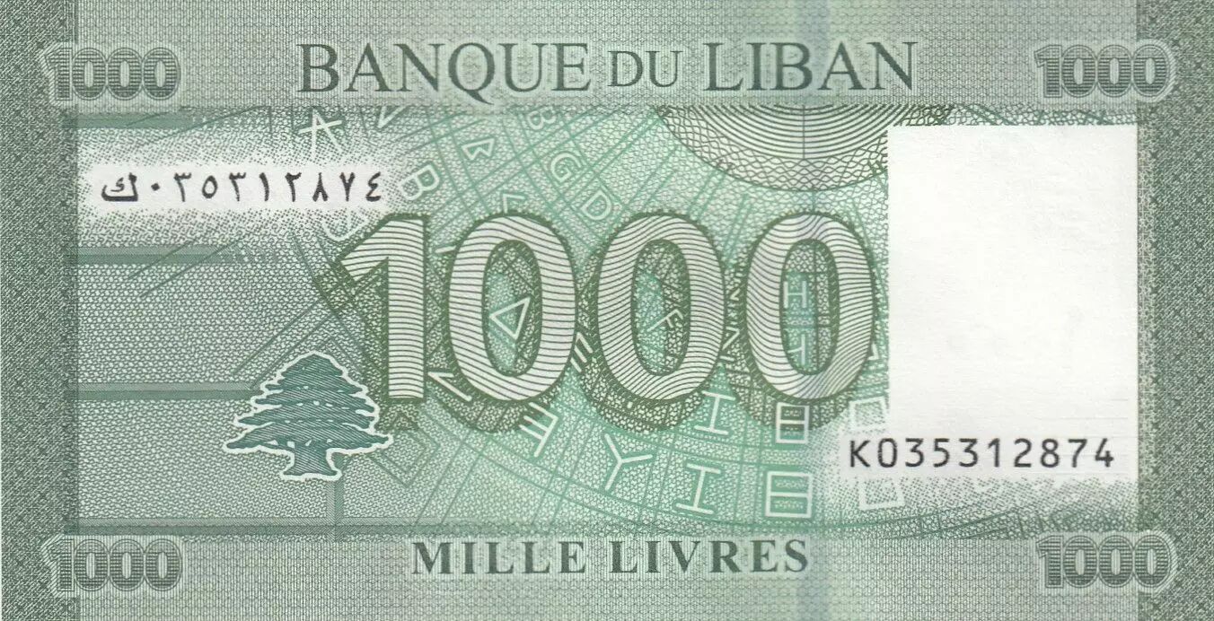 Le verso du billet arbore une impression de couleur verte. Un disque comportant des lettres latines et phéniciennes est imprimé en arrière-plan. Un cèdre figure également en bas à gauche, à côté de la grande dénomination "1000". Le texte est cette fois en français.