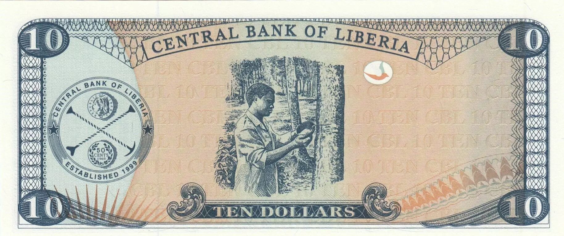 Le verso du billet illustre une scène représentant la production de caoutchouc. On y voit des travailleurs récoltant le latex des arbres à caoutchouc, une activité agricole essentielle pour le Liberia. L'image met en évidence l'importance de cette industrie pour l'économie locale et la vie des communautés rurales. La valeur nominale du billet est répétée au verso, ainsi que le nom du pays "REPUBLIC OF LIBERIA". Des motifs décoratifs et des éléments de sécurité sont également intégrés pour prévenir la contrefaçon.