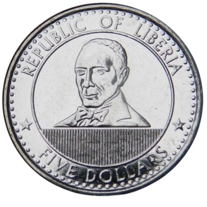 L'avers de la pièce présente un buste d'Edward James Roye, figure historique du Libéria. Sous le buste, on trouve une image latente qui révèle soit cinq étoiles, soit le texte "L$5" selon l'angle de vue. L'ensemble du motif est contenu dans un cercle intérieur.