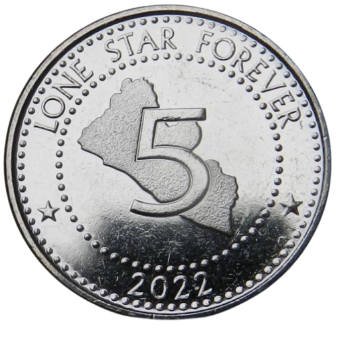 Le revers de la pièce affiche la valeur faciale sur une carte du Libéria. Cette représentation est entourée d'un cercle perlé, ajoutant un détail esthétique. Cette pièce fait partie des pièces courantes en circulation au Libéria durant la période de la République (1847 à aujourd'hui). Son numéro d'identification est N#343584 et elle est référencée sous le numéro KM# 1083.