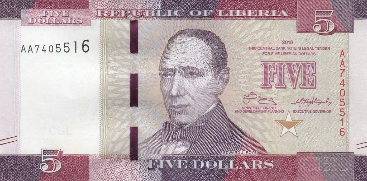 The 5 Liberian dollar banknote issued in 2016 is part of the AA series. It features Edward J. Roye and a peasant woman.