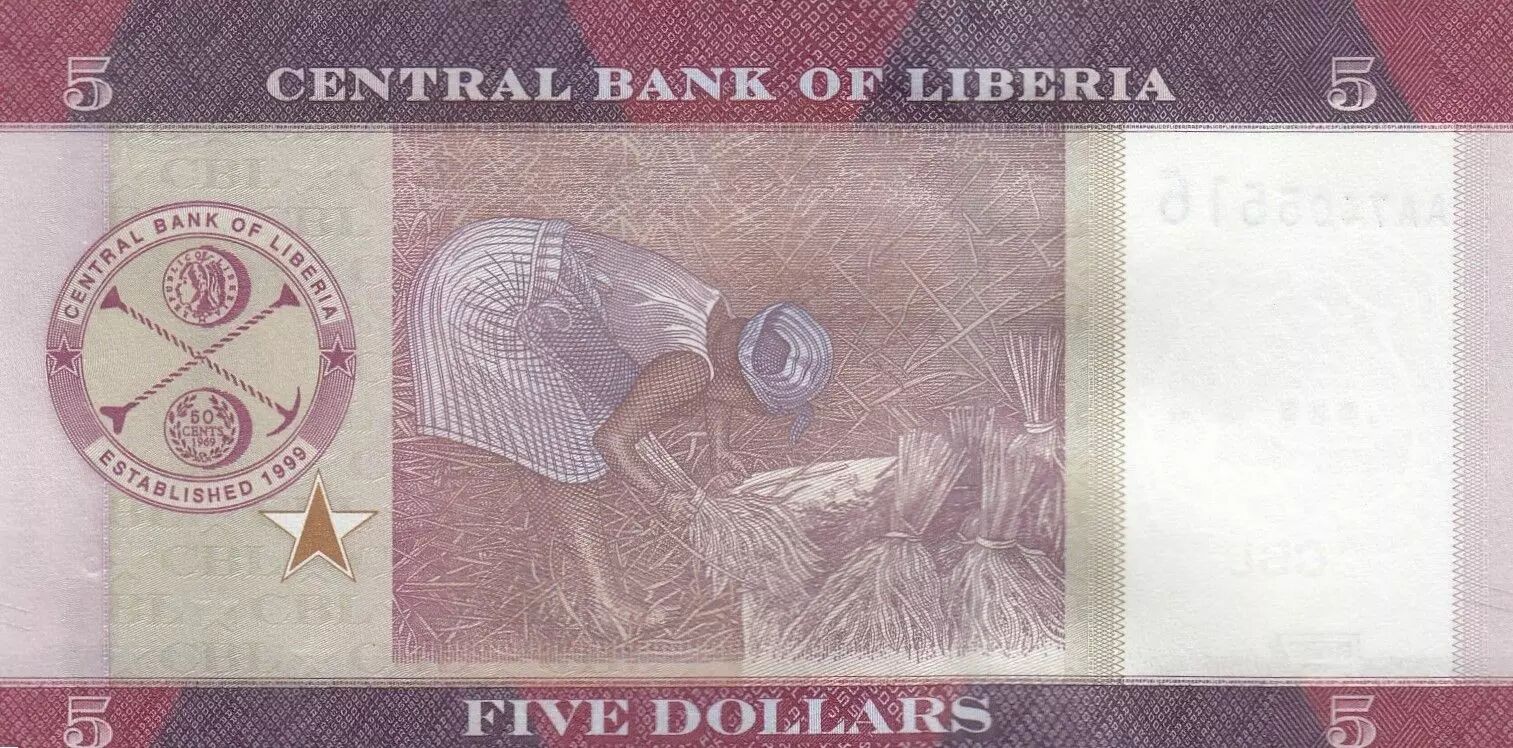 On the back of the banknote, a scene of rural life is depicted, featuring a peasant woman. This image illustrates the importance of agriculture in Liberia's economy. The background is also composed of guilloche patterns to maintain visual consistency and security. The face value "5" is repeated in the upper right and lower left corners. The words "FIVE DOLLARS" are also present on the back, completing the identification of the banknote's value. The motto "THE LOVE OF LIBERTY BROUGHT US HERE" is inscribed, reflecting the country's history and values.