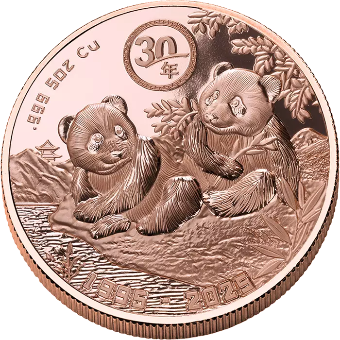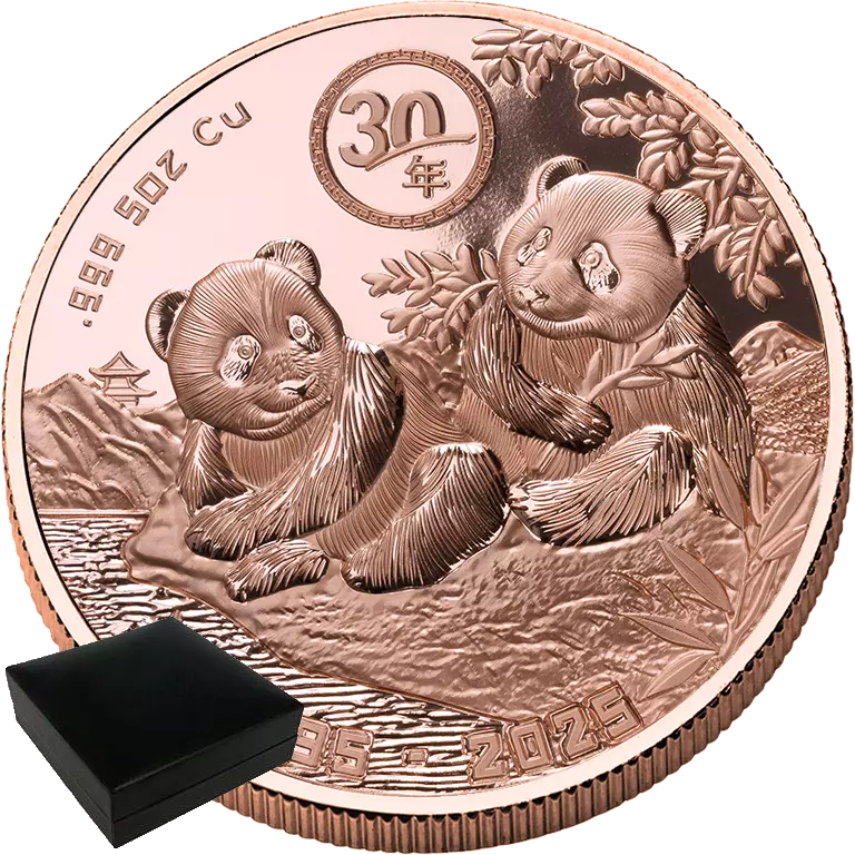 On 5 ounces of .999 fine pure copper, this coin pays detailed homage to the original 1995 motif: two pandas sitting peacefully by a river. The large diameter of 65 mm perfectly highlights the details thanks to the enhanced BU quality. The mintage of this spectacular anniversary edition is also extremely small, at only 2,500 pieces. So, order your 5-ounce copper coin featuring the famous panda now!