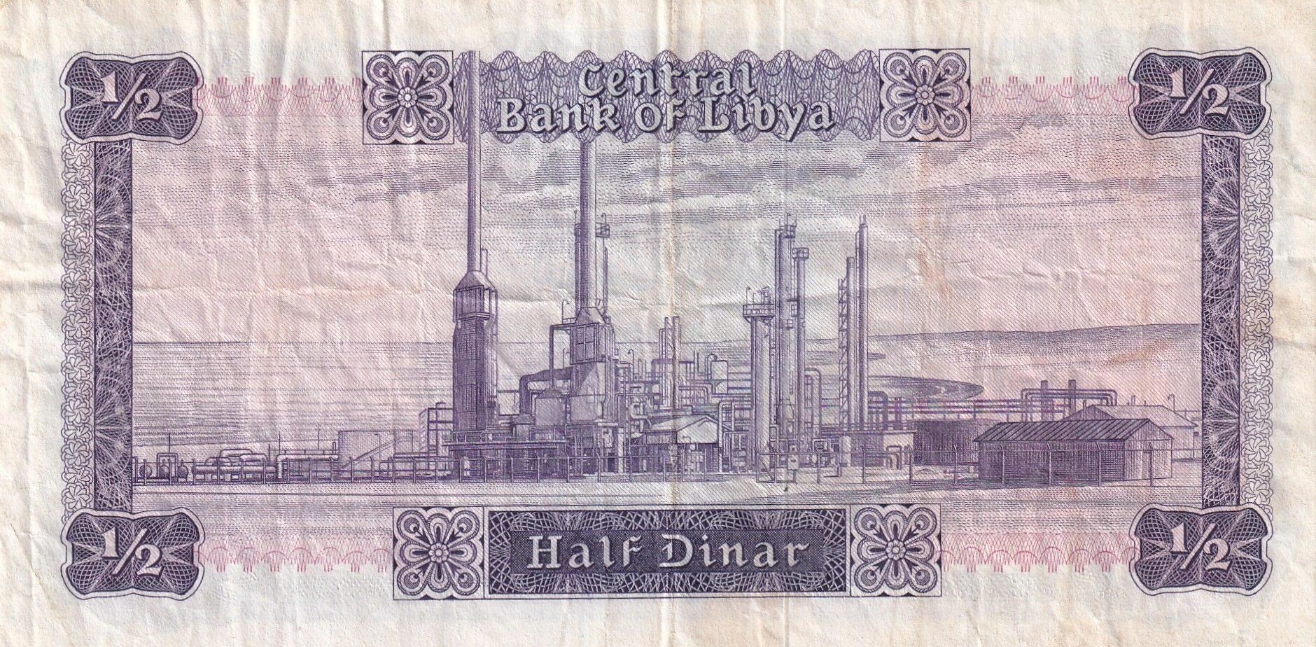 The back of the banknote illustrates the Fortress of Sabha, a historical site located in southern Libya. The fortress is depicted in its desert environment, emphasizing its strategic and historical importance. The face value of the banknote is also repeated on the back, accompanied by texts in Arabic. Geometric motifs and decorative elements complete the design.