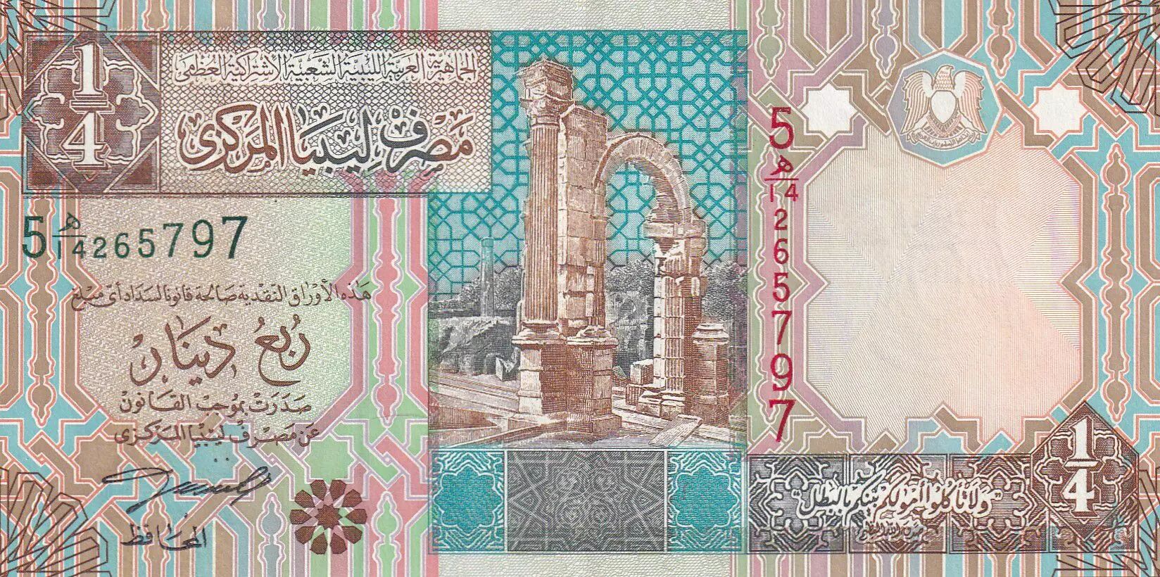 Home > > Libya 1/4 Dinar - Ruins - Fortress with palm trees - 2002 - P.62a