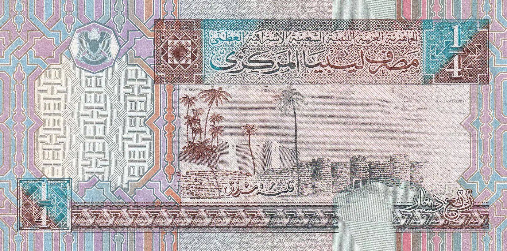 Banknote Libya 1/4 Dinar - Ruins - Fortress with palm trees - 2002 - P.62a