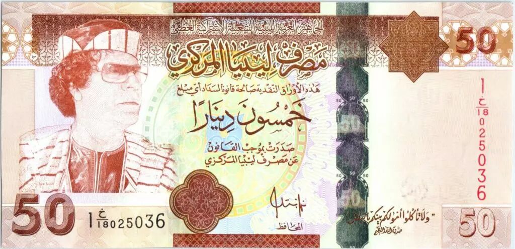 Banknote Libya 50 Dinars - Muammar Gaddafi - Building - 2008
