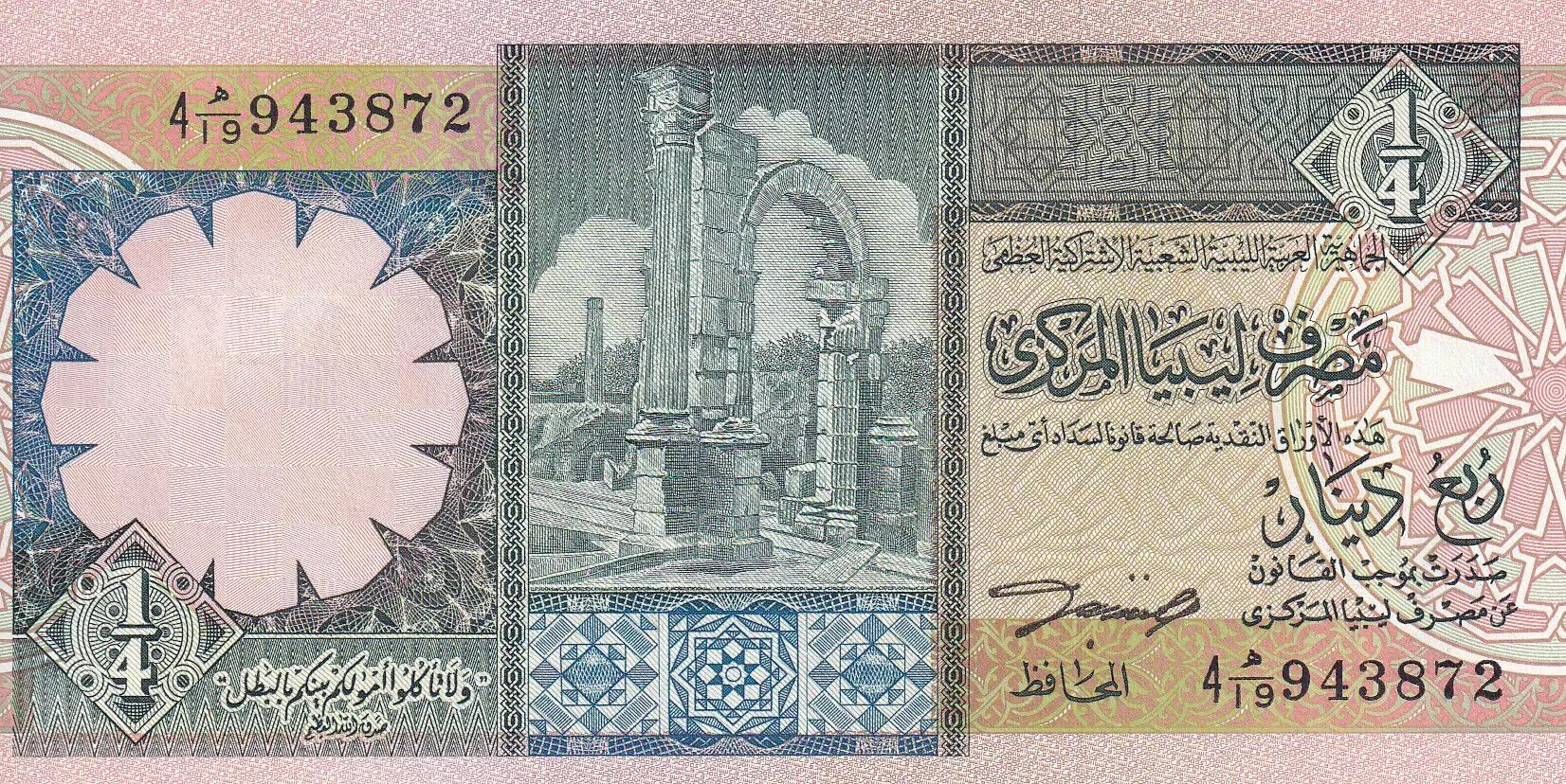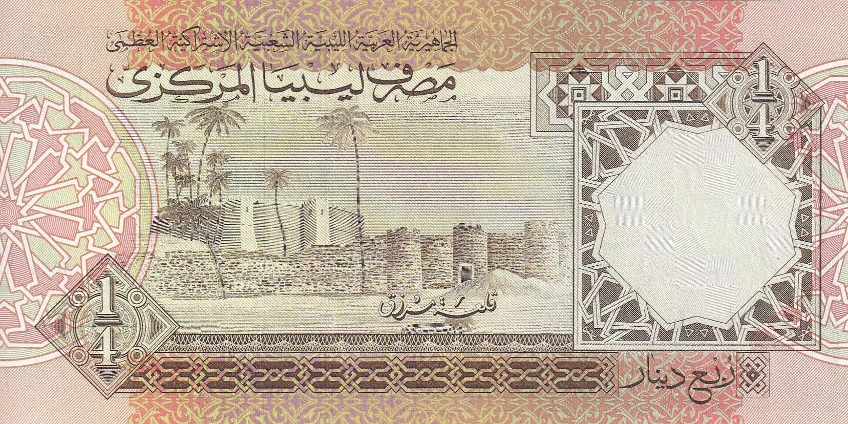 Billet Libye 1/4 Dinar - Ruines - Forteresse avec palmiers - 1990 - P.52