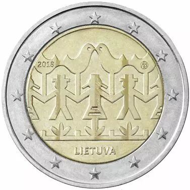 The coin features stylised figures of people and birds symbolising typical Lithuanian folk dances and songs, drawn in the cut-paper style of a popular Lithuanian art form. The coin also bears the inscription LIETUVA (LITHUANIA), the year of issue (2018) and the mint mark of the Lithuanian Mint. The outer ring of the coin bears the 12 stars of the flag of the European Union.