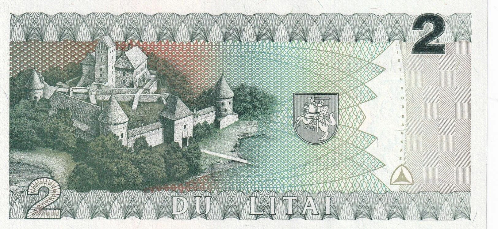Au verso du billet, une représentation du château de l'île de Trakai est visible. Ce château médiéval, situé sur une île du lac Galv?, est un symbole historique important de la Lituanie. Il témoigne du passé du pays en tant que Grand-Duché de Lituanie. Le château est un site touristique majeur et un symbole de l'héritage culturel lituanien.