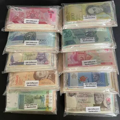 Ce lot numismatique comprend 200 billets de banque distincts provenant de plus de 30 pays différents. Chaque billet représente une unité monétaire spécifique à son pays d'origine, bien que la valeur nominale de chaque billet individuel ne soit pas spécifiée.