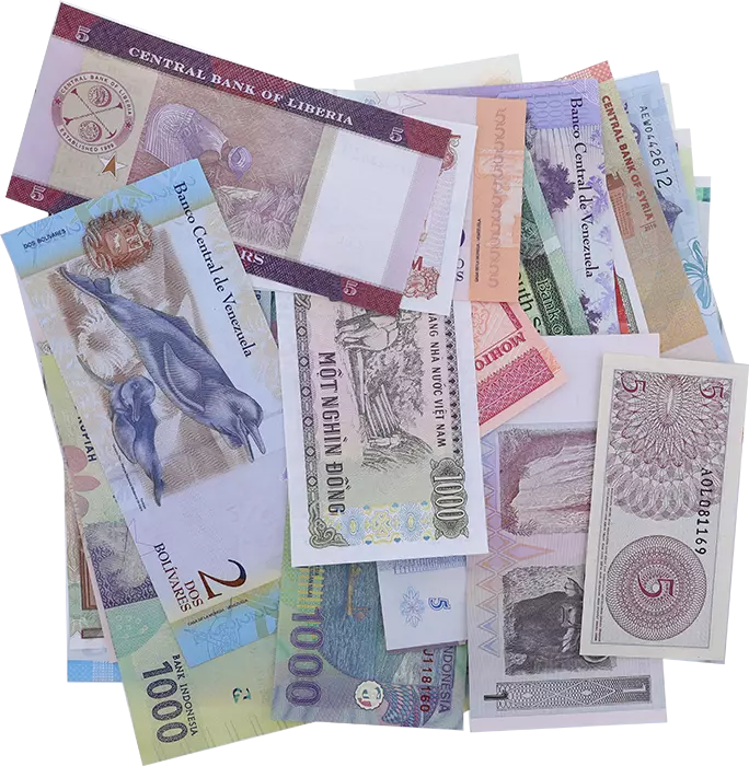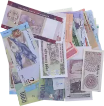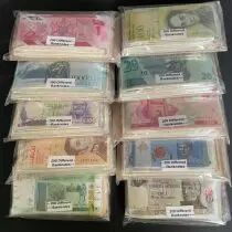 L'état de conservation des billets peut varier d'un exemplaire à l'autre, allant de billets en parfait état à des billets ayant circulé et présentant des signes d'usure tels que des plis, des taches ou des déchirures mineures. Ce lot offre un aperçu de la diversité des devises utilisées à travers le monde, et constitue une ressource potentielle pour les collectionneurs de billets de banque et les passionnés de numismatique.