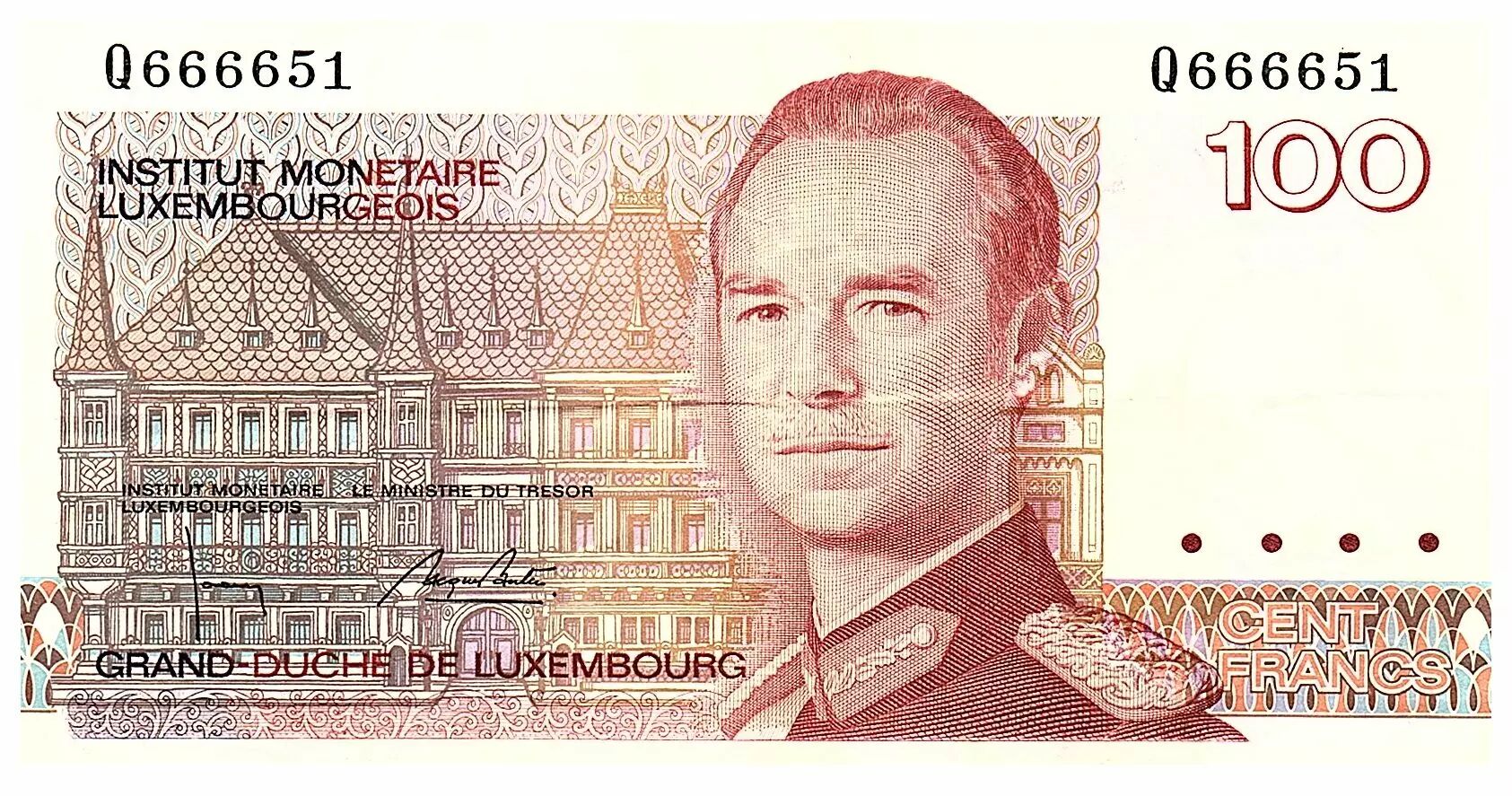Accueil > Archivage > Luxembourg 100 Francs Grand Duc Jean - Luxembourg - 1986 - Série Q666651 - P.58.a