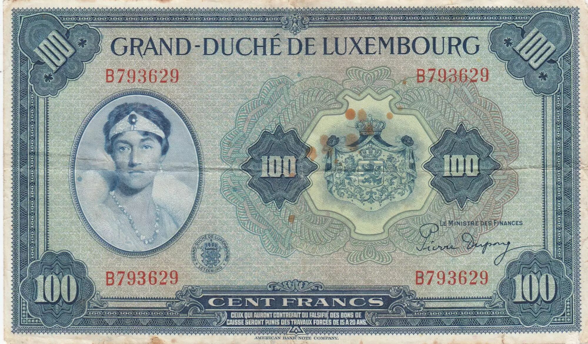 Accueil > Archivage > Luxembourg 100 Francs Grande Duchesse Charlotte - 1944 - Série B - TB