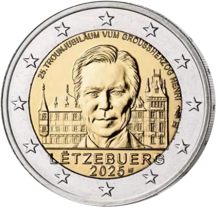 The accession to the throne of Grand Duke Henri in October 2000 accompanied the turn of the millennium. On October 7 of that year, he succeeded Grand Duke Jean and took the oath before the Chamber of Deputies. Representing the State, he is the symbol of the unity of the territory and Luxembourg's national independence. Throughout his reign, Grand Duke Henri has always defended the values of tolerance, respect, dignity and solidarity. This 2 euro commemorative coin pays tribute to the 25th anniversary of the reign of Grand Duke Henri.