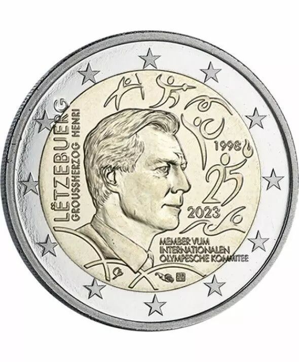 La seconde pièce de 2 € commémorative est frappée à l’occasion des 25 ans de l'admission du Grand-Duc Henri au sein du Comité International Olympique. Cette pièce sera disponible, avec des marques de frappe différentes, en « coin card » BU, en écrin BE , ainsi qu’à l’unité.