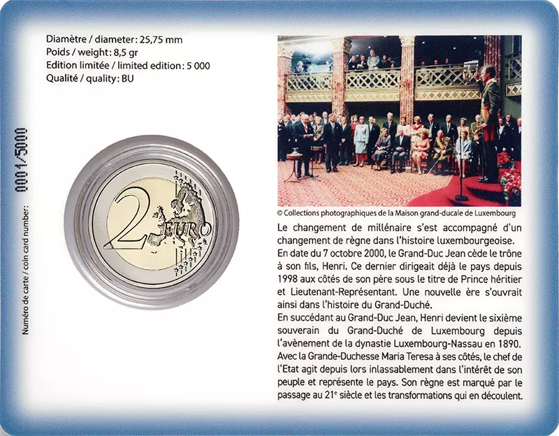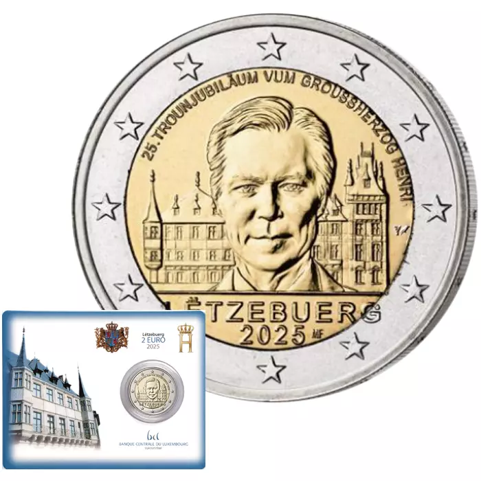 L?avènement au trône du Grand-Duc Henri en octobre 2000 accompagne le tournant du millénaire. Le 7 octobre de cette année-là, il succède au GrandDuc Jean et prête serment devant la Chambre des Députés. Représentant l?État, il est le symbole de l?unité du territoire, de l?indépendance nationale luxembourgeoise. À travers son règne, le Grand-Duc Henri a toujours défendu les valeurs de tolérance, de respect, de dignité et de solidarité. Cette pièce commémorative de 2 euros rend hommage au 25 ans de règne du Grand-Duc Henri.