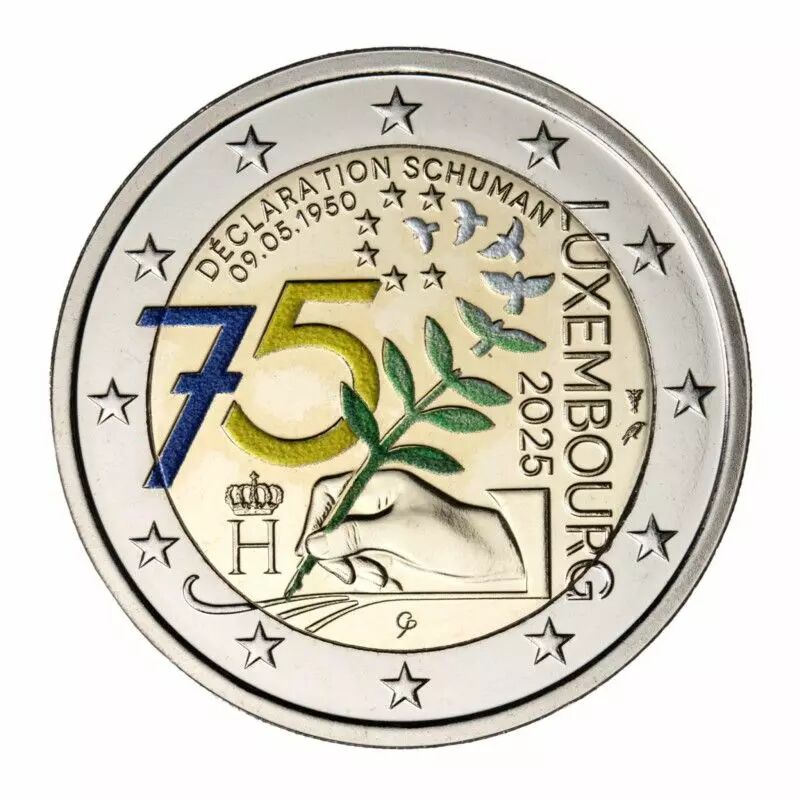« L?Europe ne se fera pas d?un coup, ni dans une construction d?ensemble : elle se fera par des réalisations concrètes créant d?abord une solidarité de fait». Cette déclaration de Robert Schuman datant du 9 mai 1950, marque un grand pas vers la construction d?une Europe unie. À travers la création de la première institution supranationale, la Communauté européenne du charbon et de l?acier (CECA), l?Europe s?est engagée dans un processus de paix et de coopération inédit. Cette pièce commémorative de 2 euros célèbre les 75 ans de la déclaration Schuman.