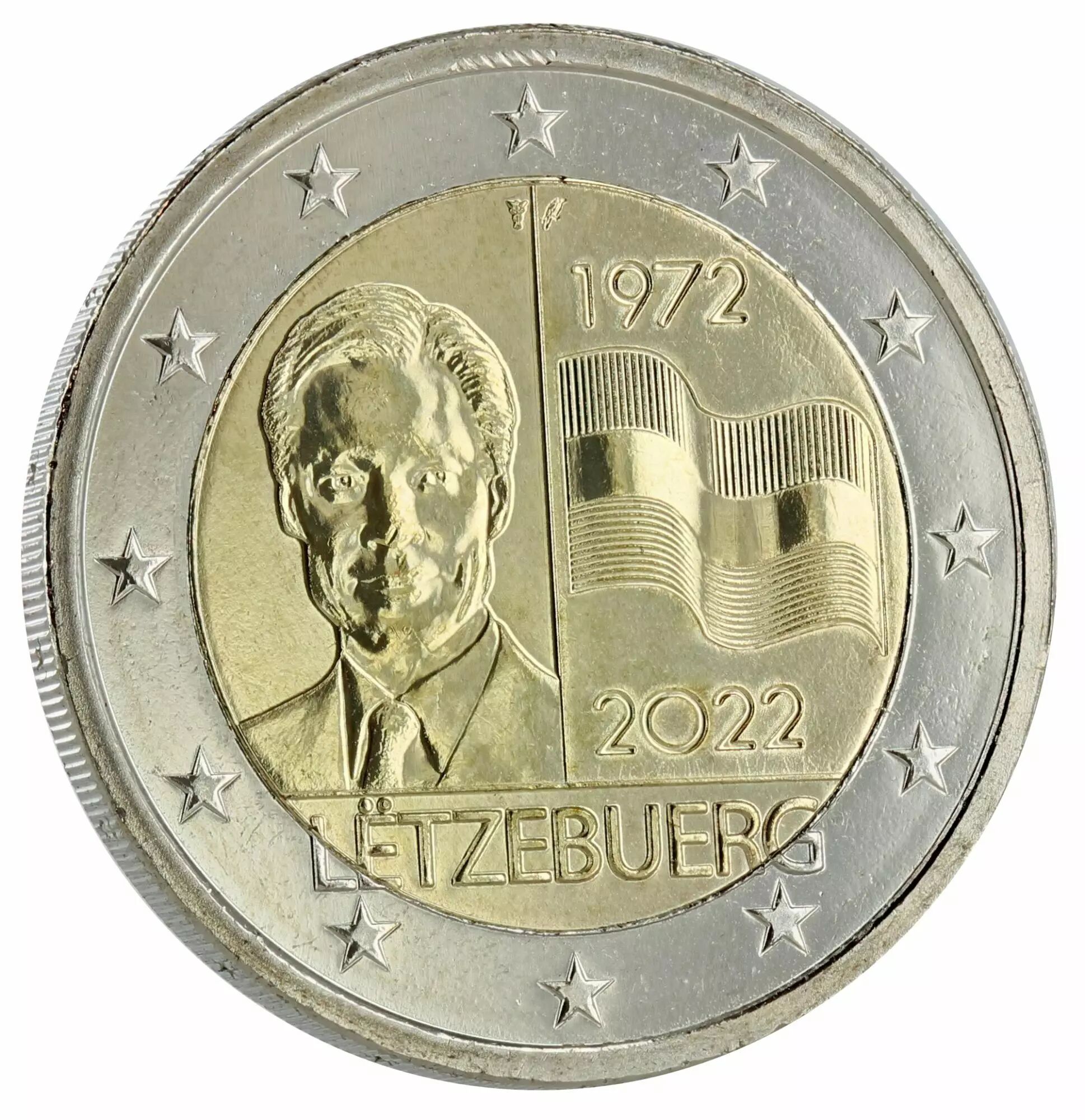 La pièce commémorative de 2 € 2022 est frappée en l'honneur du drapeau tricolore du Grand-Duché de Luxembourg dont la protection légale a été inscrite dans la loi du 23 juin 1972 il y a 50 ans. Cette pièce sera disponible avec des marques de frappe différentes en « coin card » BU en écrin BE ainsi qu’à l’unité.