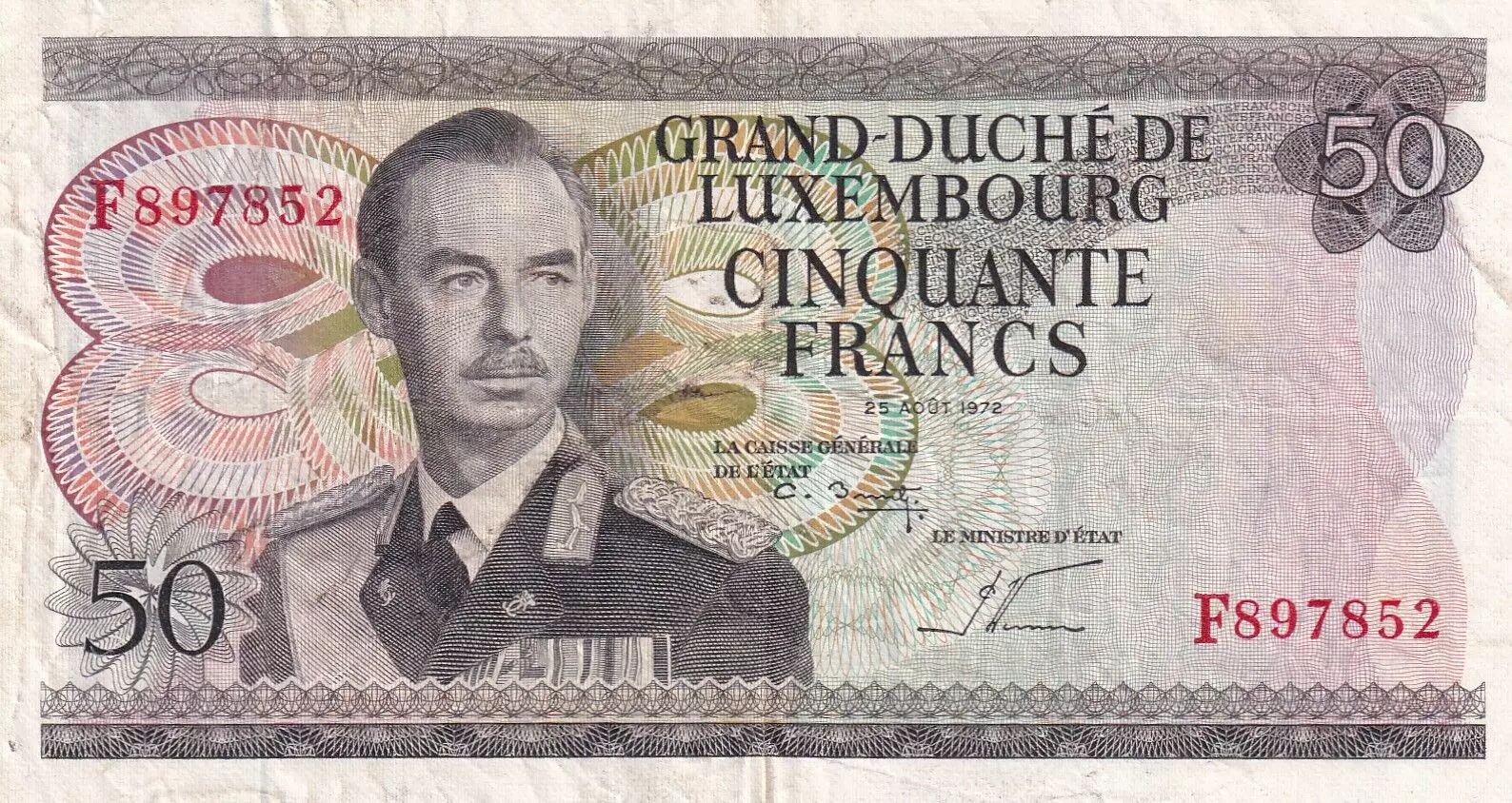 Home > > Luxembourg 50 Francs Grand Duc Jean - Factory - 25-08-1972 - Serial F