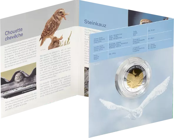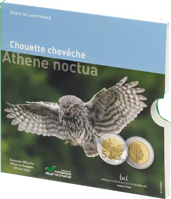 The ?Fauna? series, developed in partnership with the Hëllef fir d'Natur Foundation, is dedicated to species requiring careful protection and monitoring. In 2024, the BCL joins scientists in expressing its concern about the risk of extinction in Luxembourg of the little owl, the smallest species of owl in the country. The BCL's Nordic silver and gold coin is packaged in a booklet presenting this bird of prey in its natural habitat.
