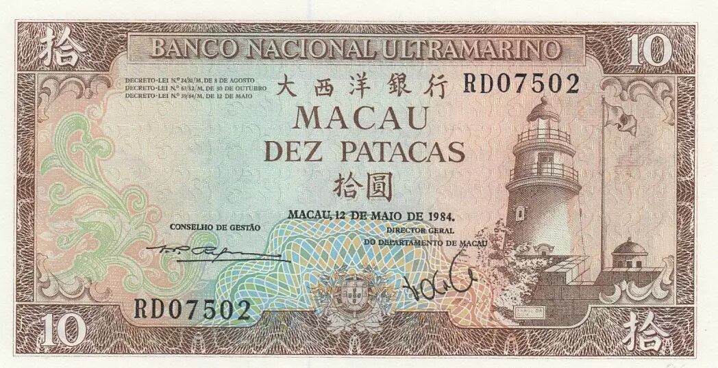 Banknote Macao 10 Patacas Lighthouse - Praia Grande - 1984 - Serial RD