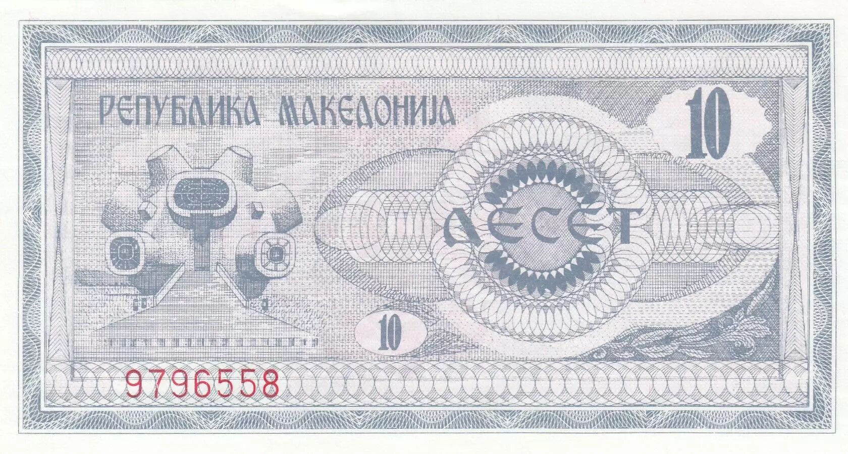 Ce billet de banque commémoratif, d'une valeur de 10 denari, a été émis en 1992 par la Banque nationale de Macédoine. Il s'agit d'un billet de banque du Laos avec une surcharge commémorative imprimée en Cyrillique.