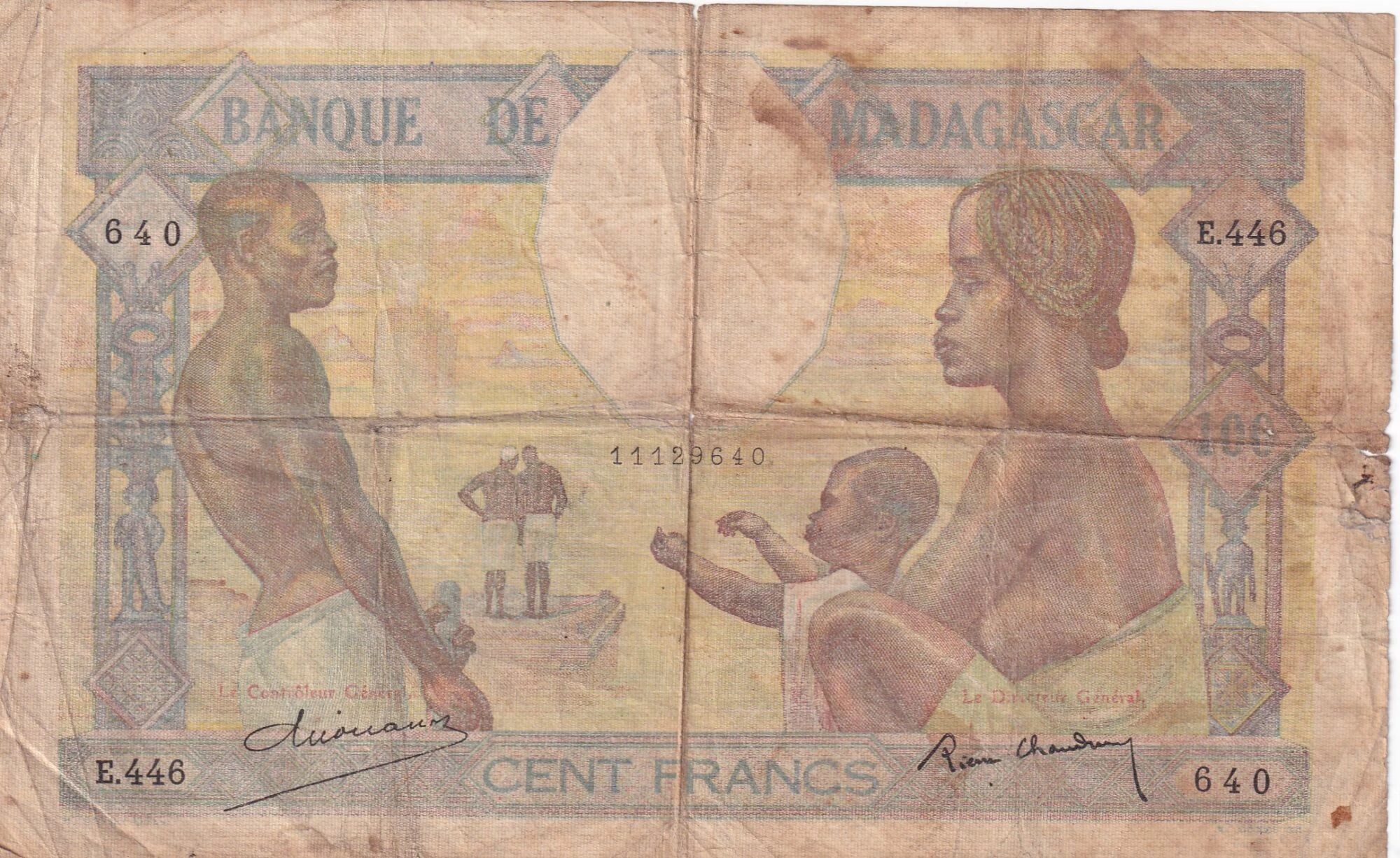 Le recto du billet présente, sur la gauche, un père de famille faisant face à sa femme et son enfant, situés à droite. En arrière-plan, à gauche, deux hommes se tiennent debout sur un quai, attendant un cargo au large. Des motifs d'aloalo sont présents à droite et à gauche de la vignette. Les inscriptions en écriture latine comprennent la mention "BANQUE DE MADAGASCAR", la valeur "100", les titres "Le Contrôleur Général" et "Le Directeur Général", ainsi que "CENT FRANCS". Les noms des artistes impliqués, "H. CAYON DEL." et "E. GASPÉ SC", sont également indiqués. Eugène Gaspérini est identifié comme le graveur et Henri Félix Cayon comme le dessinateur.