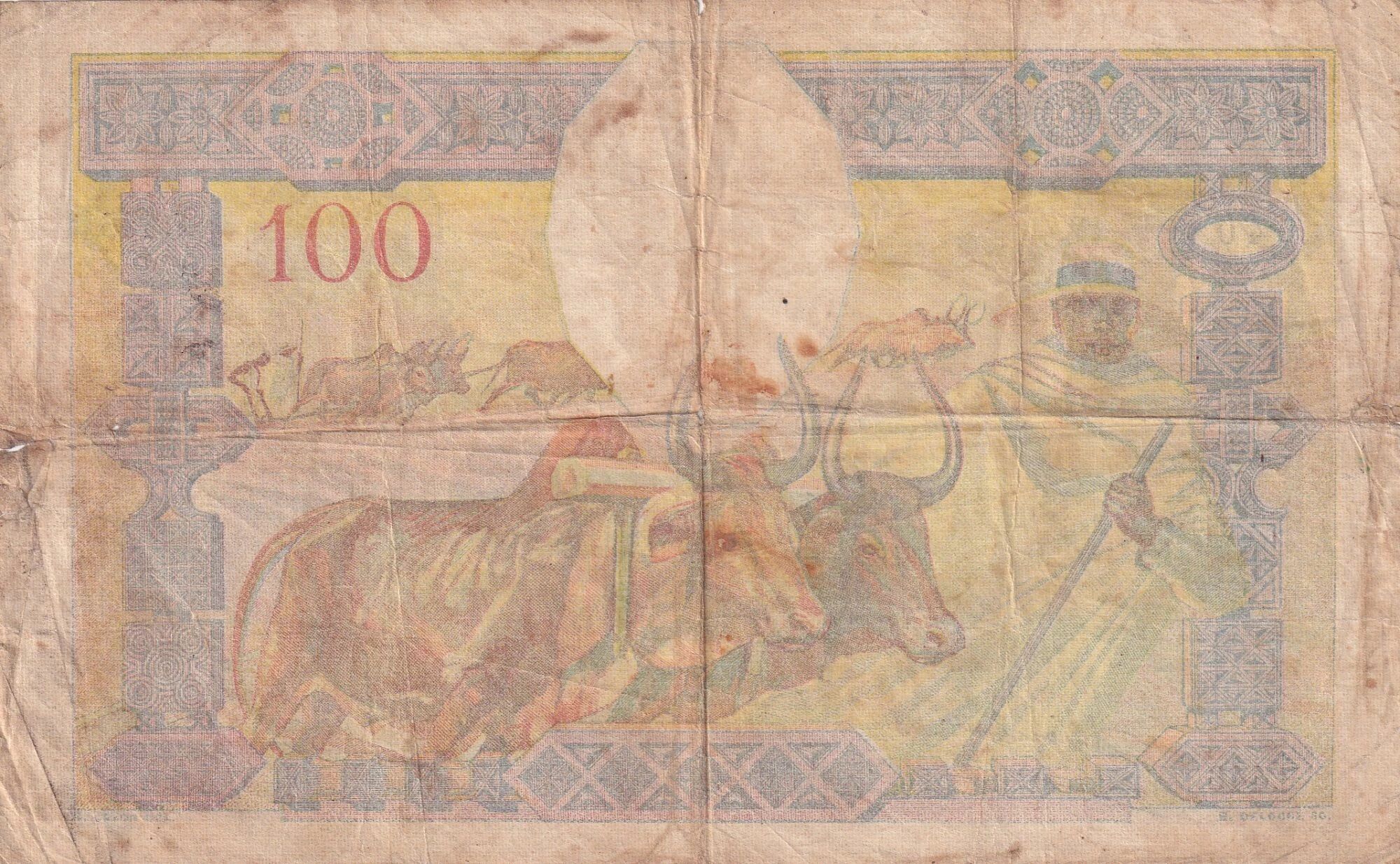 This banknote, with a nominal value of 100 francs, was issued by the Bank of Madagascar between 1928 and 1950. It belongs to the period of the French colony (1897-1946) and is made of paper. Its dimensions are 183 mm in length and 113 mm in width, and its shape is rectangular. It has been demonetized.