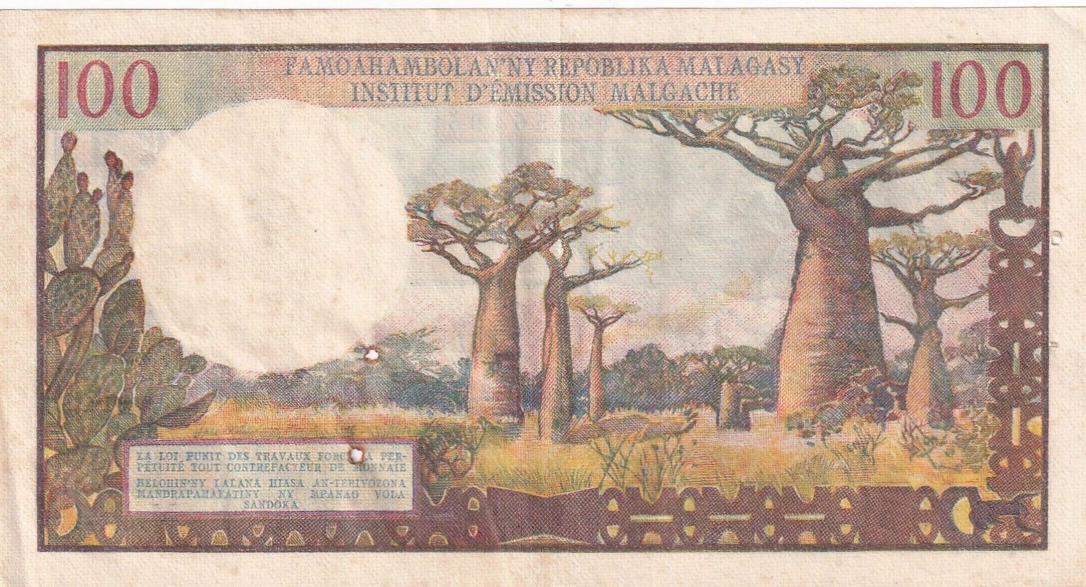 Le billet de 100 francs, émis par Madagascar entre 1964 et 1973, présente des dimensions de 130 mm de longueur sur 70 mm de largeur. Ce billet appartient à la série N.20.