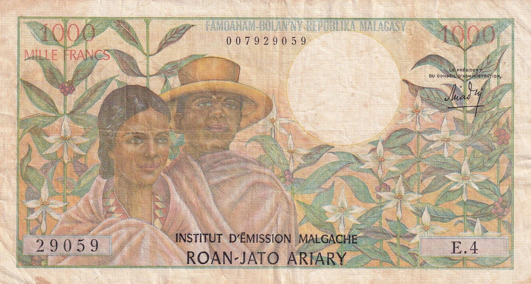 Ce billet de banque, d'une valeur nominale de 1000 francs, a été émis à Madagascar entre 1964 et 1970. Il appartient à la série E.4.