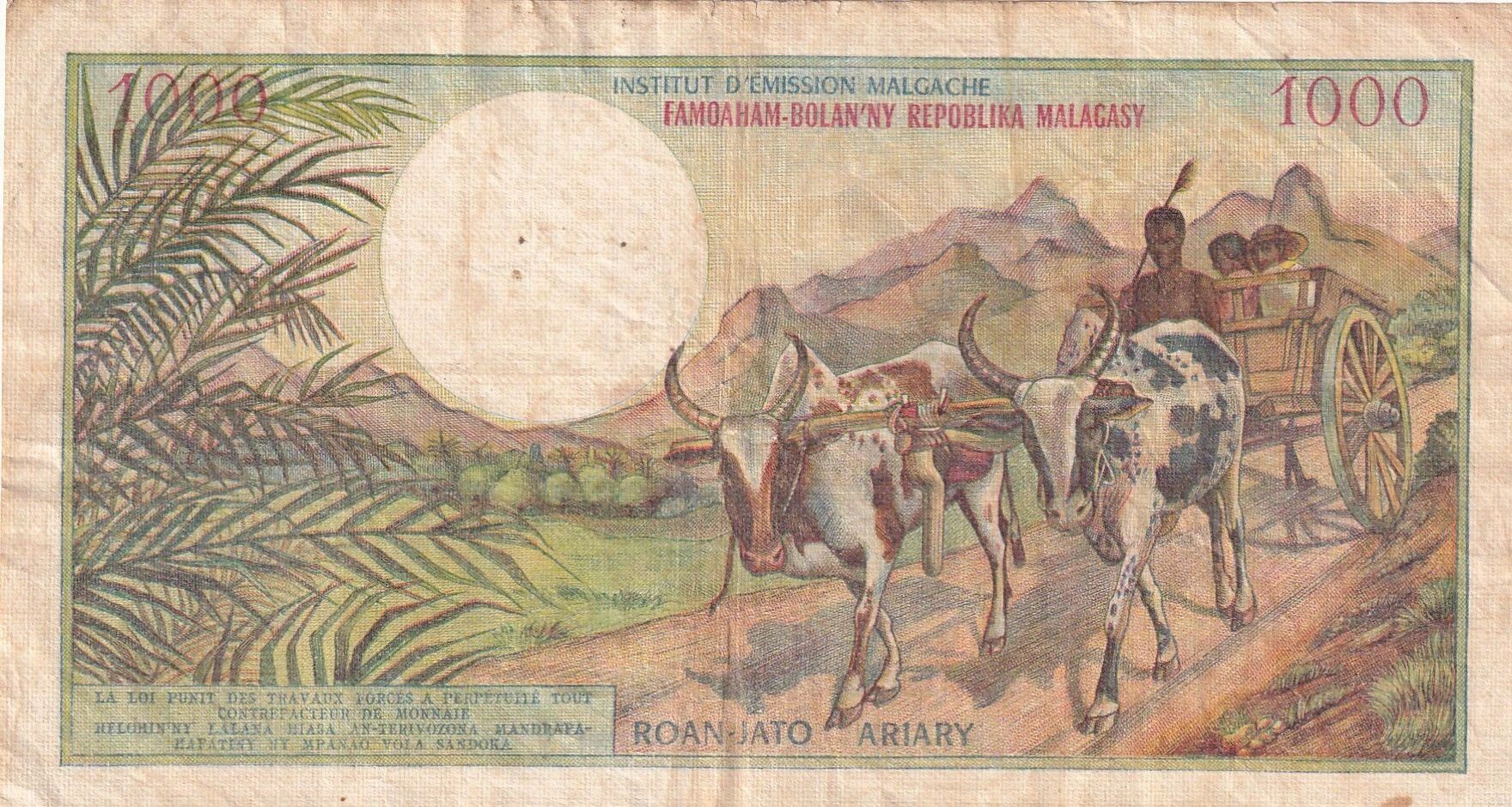 On the back, we observe, in the center right, two zebus pulling a cart on which the herdsman and two passengers are seated. A mountainous landscape forms the background of this scene. A ravinala is visible on the left. The bilingual Penal Code is inscribed at the bottom left.