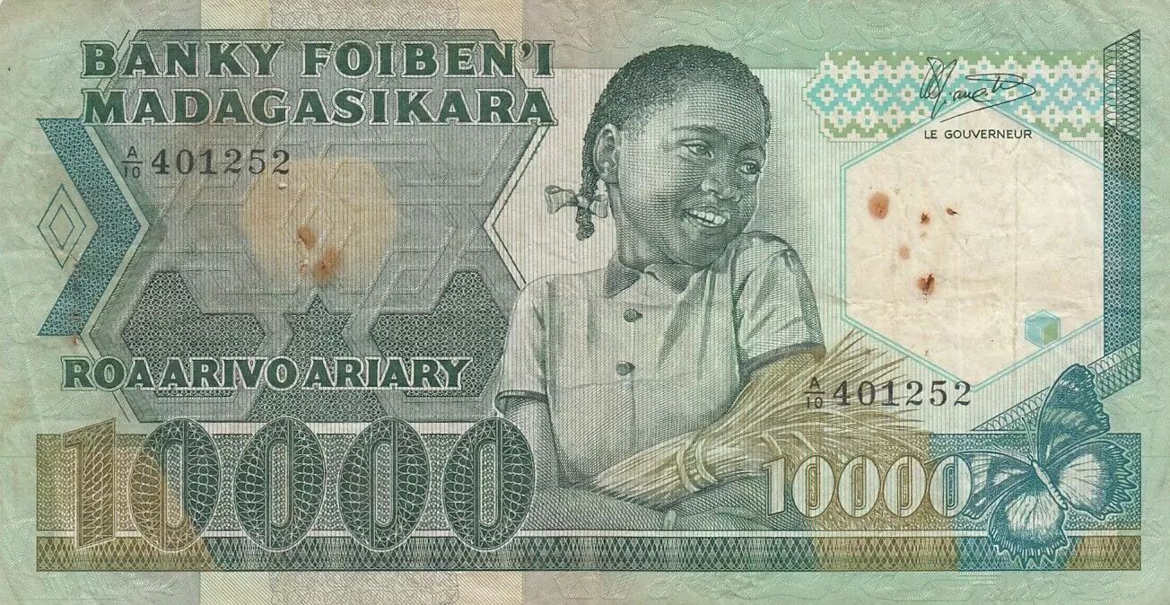 Banknote Madagascar 10000 Ariary - Children - Farmers - Serial A/10 - 1987