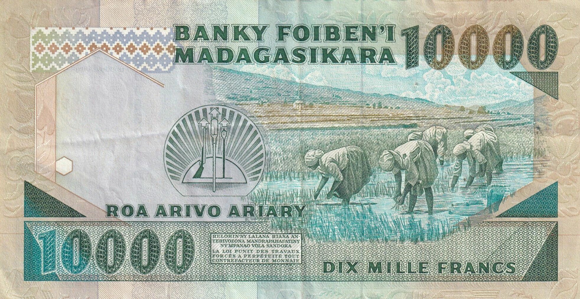 Ce billet de banque de Madagascar, d'une valeur nominale de 10000 francs, a été émis entre 1988 et 1994. Il appartient à la série DA et pèse 1 gramme. Ses dimensions sont de 168 mm de longueur sur 88 mm de largeur.