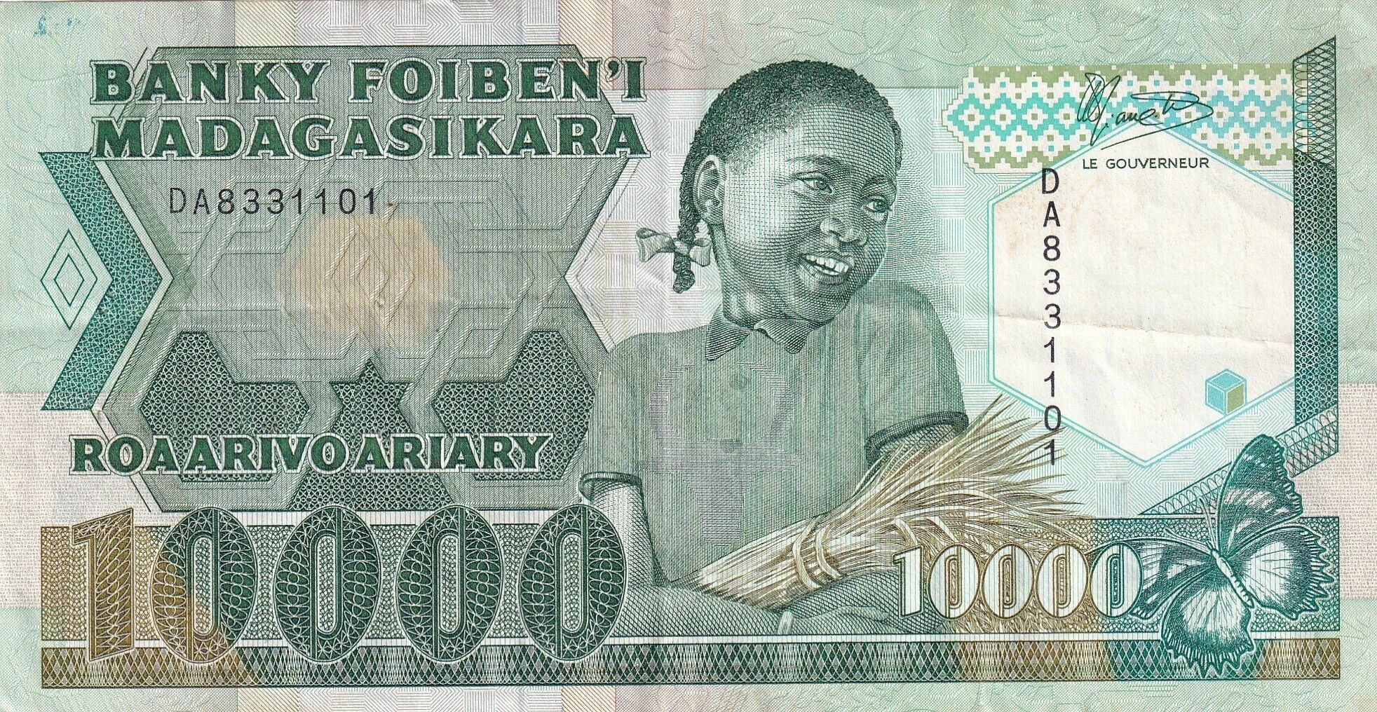 This banknote from Madagascar, with a face value of 10,000 francs, was issued between 1988 and 1994. It belongs to the DA series and weighs 1 gram. Its dimensions are 168 mm long and 88 mm wide.
