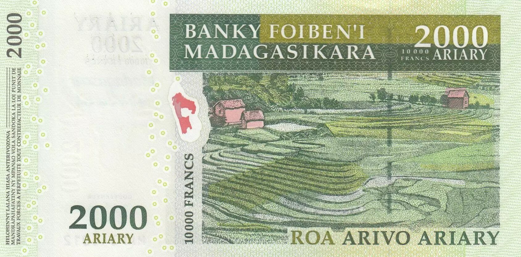 Ce billet de banque de Madagascar a une valeur nominale de 2000 ariary. Il a été émis en 2008.